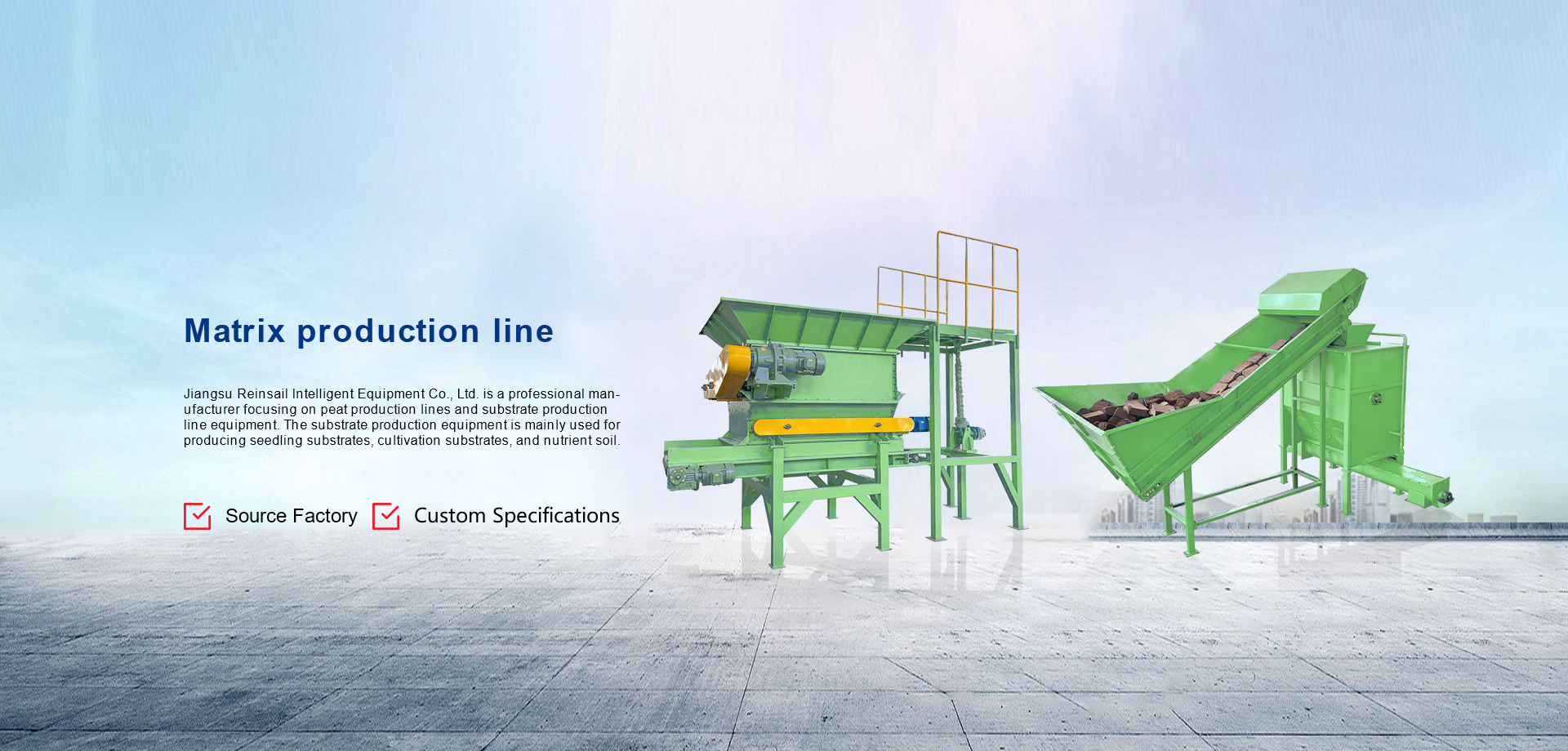 Jiangsu Reinsail Intelligent Equipment Co., Ltd. is a professional manufacturer focusing on peat production lines and substrate production line equipment. The substrate production equipment is mainly used for producing seedling substrates, cultivation substrates, and nutrient soil. Yueyang is a professional substrate complete equipment manufacturer capable of volumetric batching and volumetric packaging, and it is also the first domestic company to reach international advanced levels in professional substrate mixing line design and manufacturing. Currently, Yueyang's products cover professional substrate production and soil conditioner production, encompassing all process control aspects from raw material pretreatment, precise batching, trace additive addition, wetting agent addition, dust-free mixing, packaging, to automatic stacking and handling.